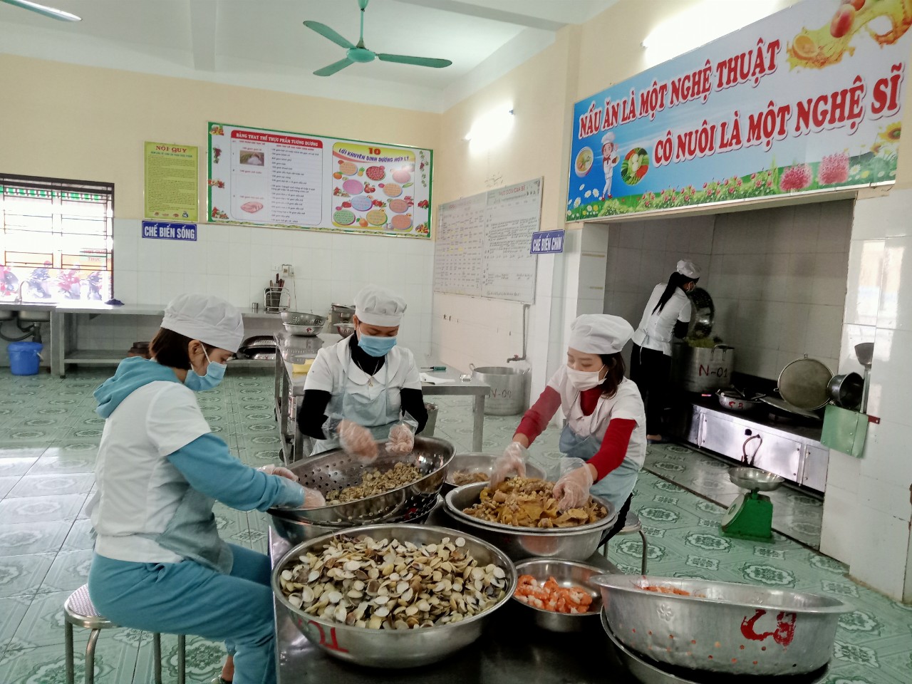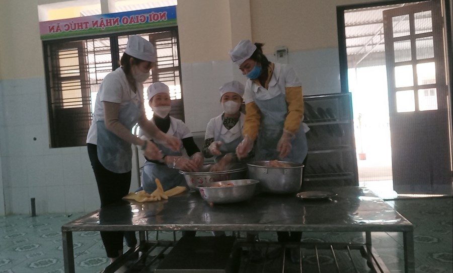 Nhân viên phục vụ bán trú Trường Mầm non Dũng Tiến chế biến thức ăn phục vụ bữa trưa cho trẻ.
