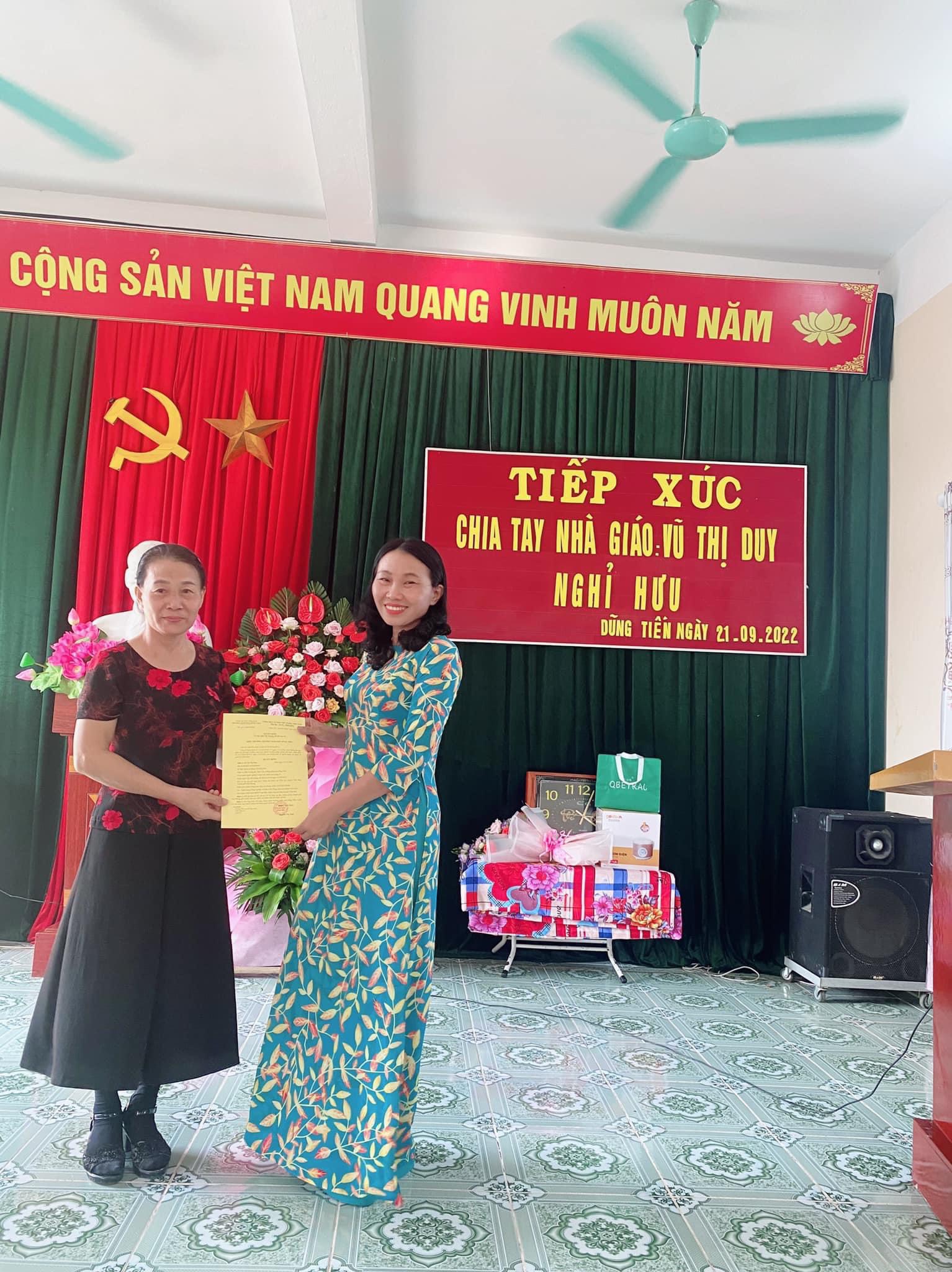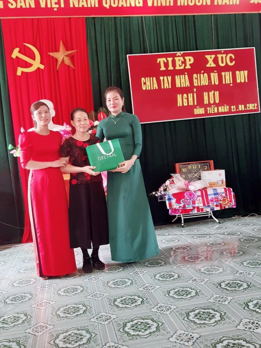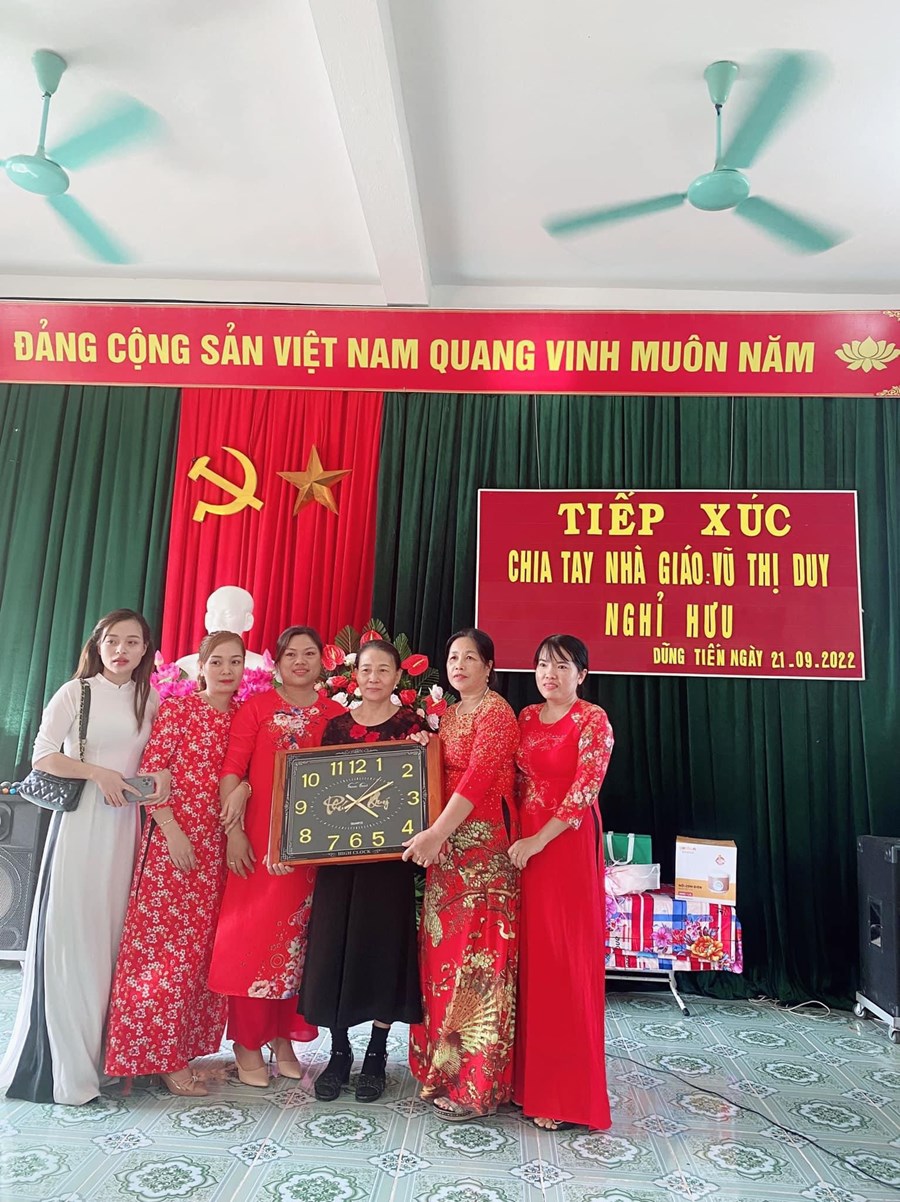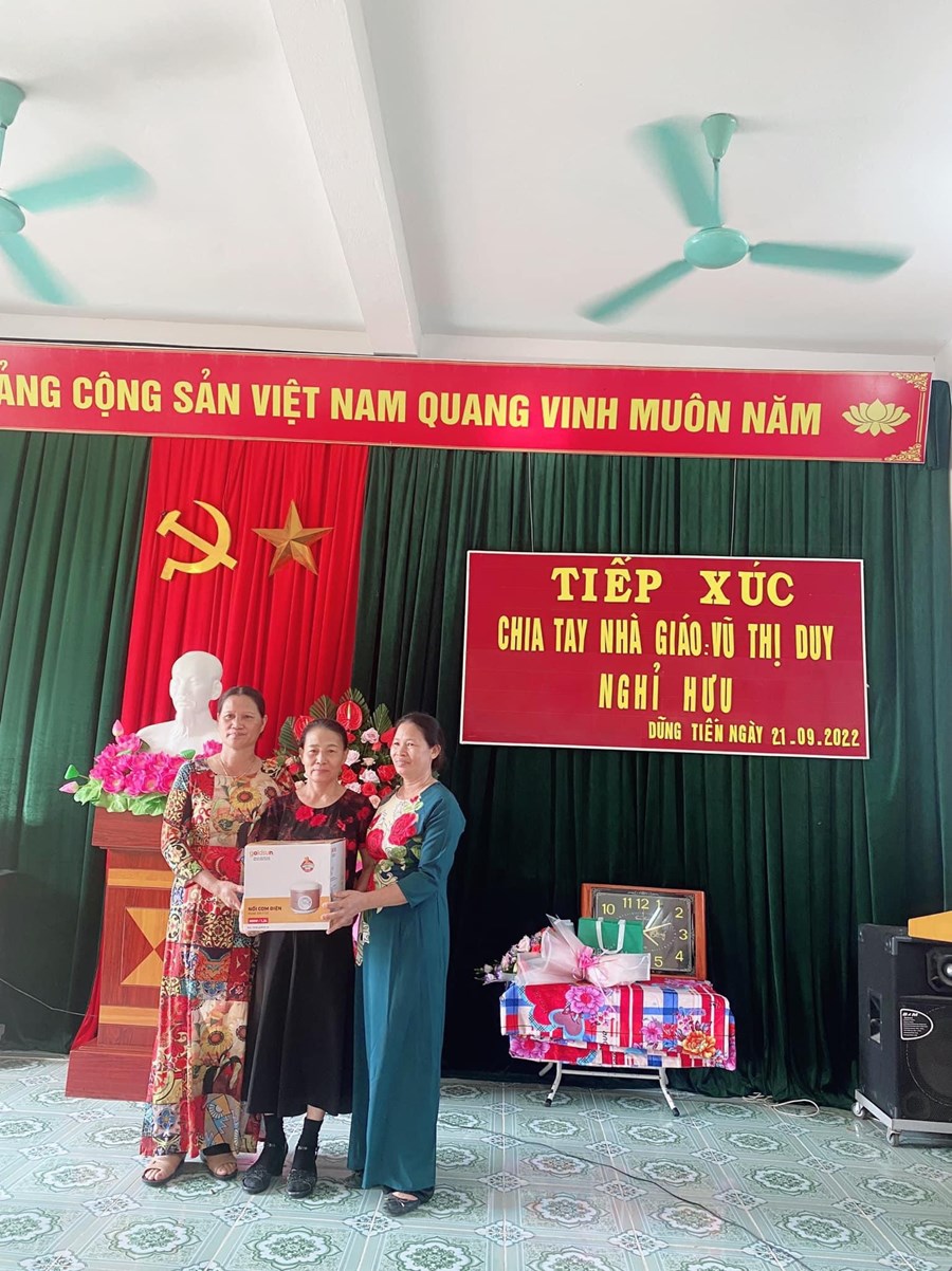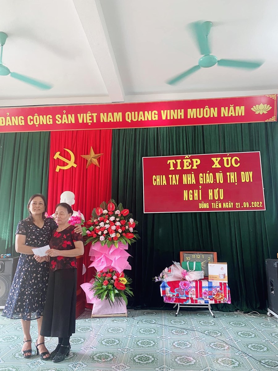 Những cống hiến của cô với mái trường Mầm non Dũng Tiến này, đó là là tình cảm, là sự dìu dắt biết bao thế hệ học trò, tấm lòng tận tuỵ, cần mẫn, nhiệt tình của các cô trong công tác.. Chia tay các cô chúng ta không thể nào quên hình ảnh những đồng nghiệp, đồng chí ân cần, chan hoà, cởi mở.Những lời động viên chia sẻ của các đồng chí sẽ mãi mãi theo chúng tôi trong hành trang phía trước.Tinh thần, ý chí, tâm huyết của Đ/c với ngành, với nghề đã để lại cho chúng tôi, thế hệ trẻ của nhà trường những bài học quý báu, những năm công tác trong ngành giáo dục cô đã cống hiến hết mình và giờ đây các cô được nghỉ hưu, chúng ta cảm thấy bùi ngùi xao xuyến phải nói lời chia tay. Chúc Đ/c thật nhiều sức khỏe, hạnh phúc bên gia đình, tiếp tục đóng góp sức lực, trí tuệ cho địa phương.