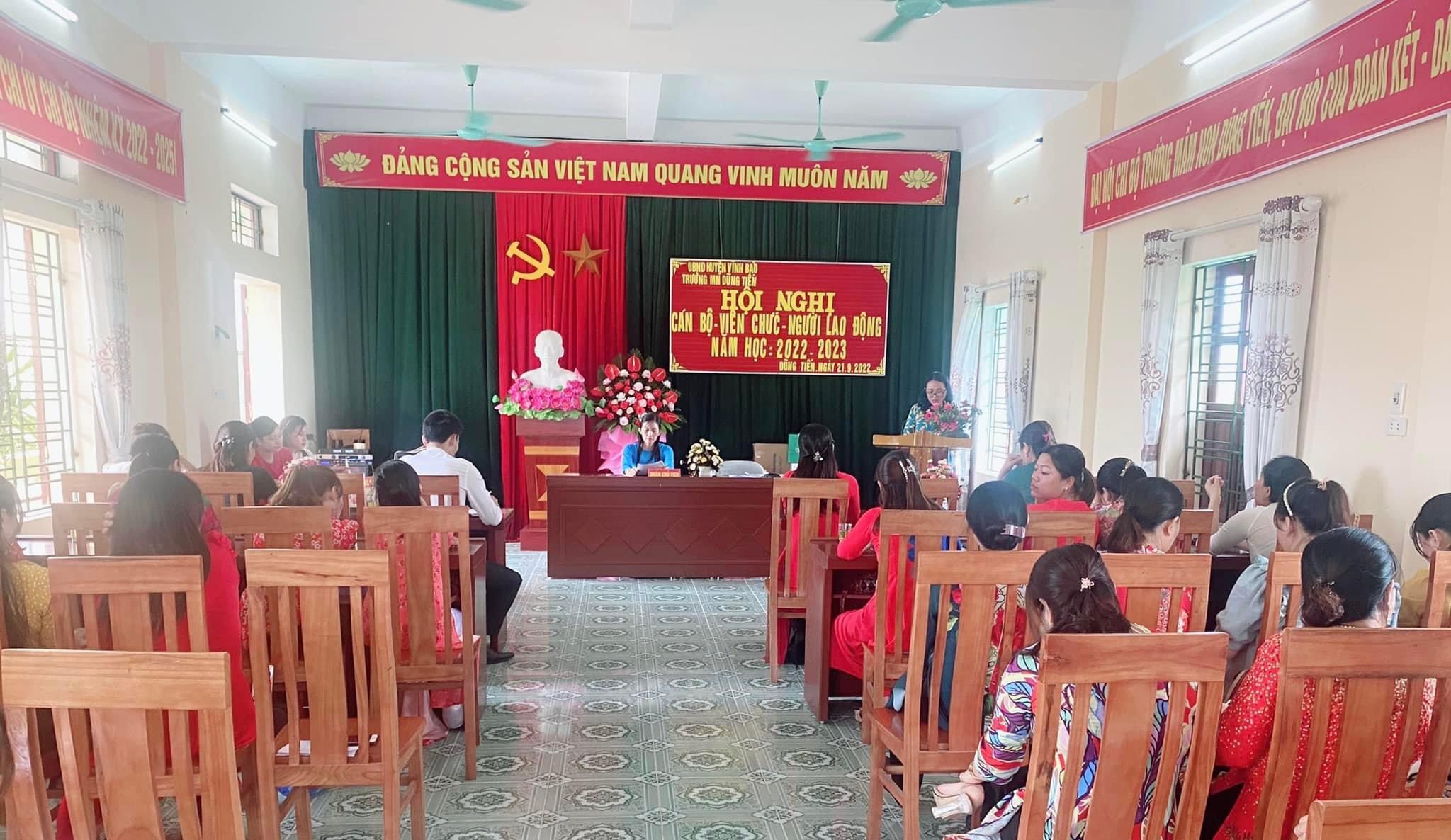 Hội nghị cán bộ, viên chức, Người lao động năm học 2022 - 2023 Trường Mầm Dũng Tiến đã thành công tốt đẹp trong không khí phấn khởi, tự hào về những kết quả đạt được. Tập thể cán bộ, giáo viên, nhân viên không ngừng nổ lực, khắc phục khó khăn, phấn đấu hoàn thành tốt nhiệm vụ năm học 2022 – 2023.