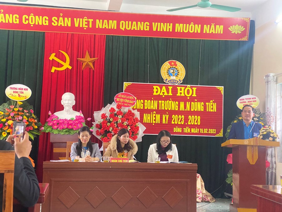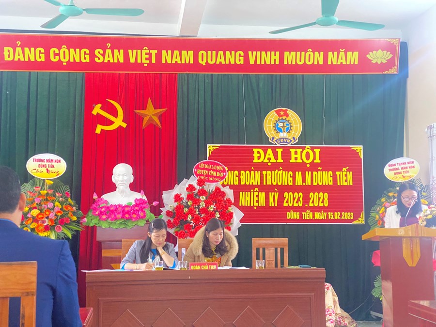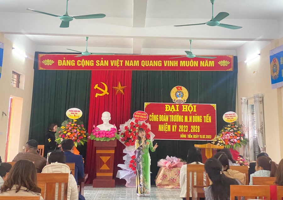 Phát biểu tại Đại hội, đồng chí Nguyễn Thị Tính – Bí thư chi bộ, Hiệu trưởng nhà trường đã biểu dương kết quả mà Công đoàn Trường Mầm non Dũng Tiến đã đạt được trong thời gian qua, đồng thời đề nghị Công đoàn Trường Mầm non Dũng Tiến làm tốt hơn nữa công tác giáo dục tư tưởng chính trị cho cán bộ, đoàn viên: thường xuyên chăm lo đời sống vật chất và tinh thần, bảo vệ quyền và lợi ích chính đáng của đoàn viên, cán bộ viên chức lao động. Phát huy những kết quả đã đạt được, công đoàn cơ sở Trường mầm non Dũng Tiến tiếp tục xây dựng và tổ chức hoạt động của Công đoàn ngày càng vững mạnh, thực sự đưa sự nghiệp giáo dục ngày càng đi lên vững chắc.