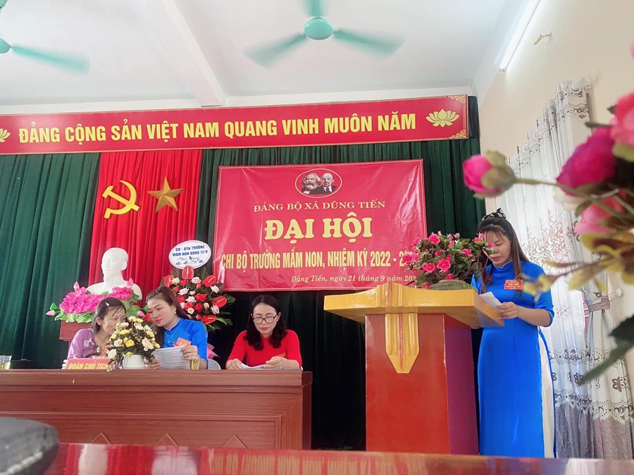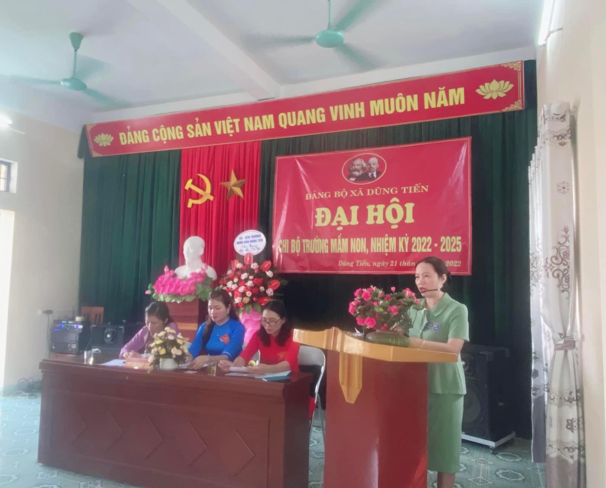 Đại hội đã tiến hành bầu ra Cấp ủy, Bí thư, phó bí thư nhiệm kỳ 2022-2025. Đồng chí Nguyễn Thị Tính được Đại hội tín nhiệm bầu làm Bí thư chi bộ. Đồng chí Nghiêm Thị Yến làm phó bí thư chi bộ. Với tinh thần làm việc khẩn trương, nghiêm túc và trách nhiệm, Đại hội Chi bộ trường Mầm non Dũng Tiến nhiệm kỳ 2022 - 2025 đã thành công tốt đẹp. Tập thể Chi bộ trường mầm non Dũng Tiến quyết tâm tổ chức thực hiện đạt hiệu quả tốt các mục tiêu, phương hướng trong nhiệm kỳ tới.